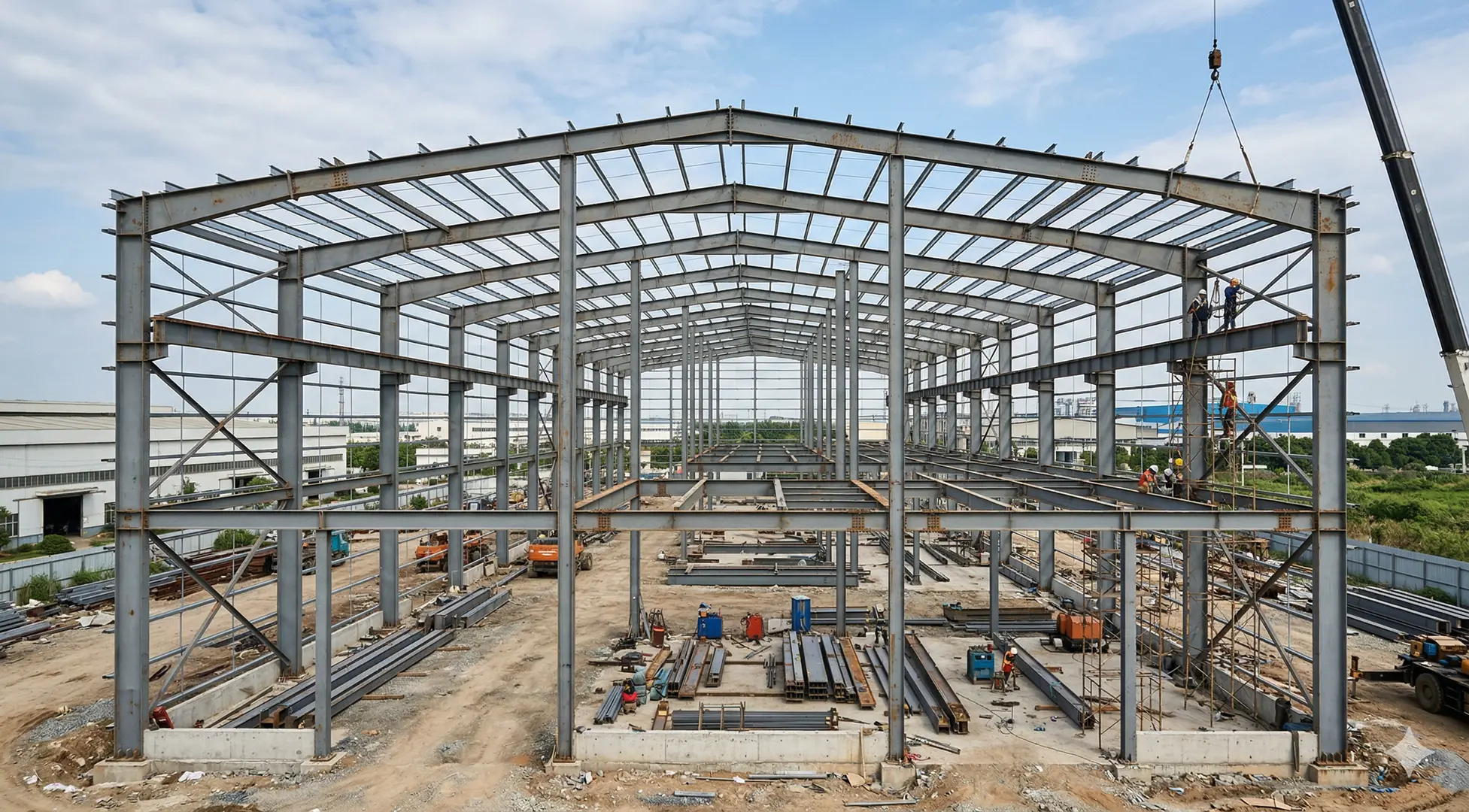 Custom-designed steel structural frameworks optimized for industrial workshops, warehouses, and commercial complexes.